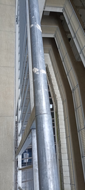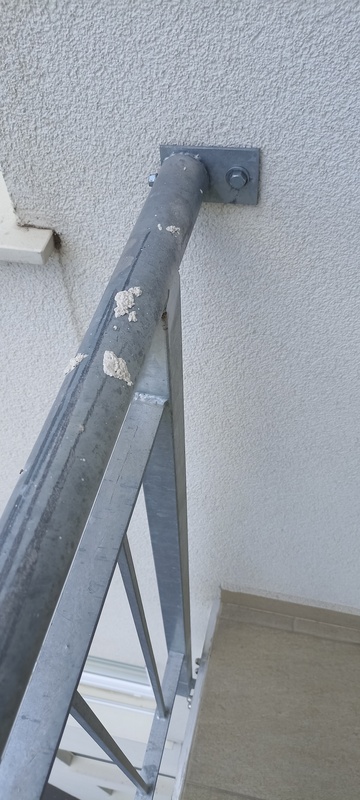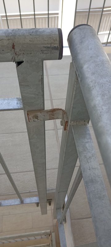 | 59. | 6. emeleten a korlátrögzítő sarokvasnál a csavar elnyíródott, a korlát stabilitása nem megfelelő. BK A 614-os lakás előtti korlát sarok javítjuk BK Elkészült: 2025 07 22 KK A jelölt helyen a javítás megtörtént, azonban ez egy általános, technológia hiba, mely az épület egészében megfigyelhető. Az anyagválasztás nem megfelelő és időtálló, anyagában ellenálló szerelvénnyel kell megvalósítani a kiegészítő és rögzítő elemeket is. Általános | |