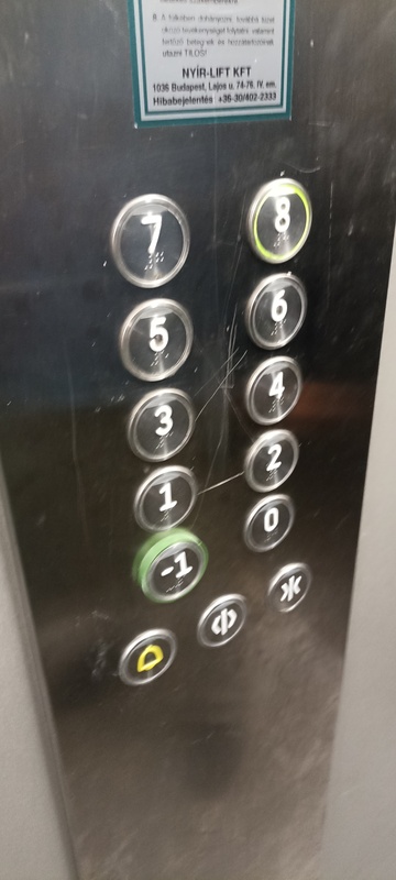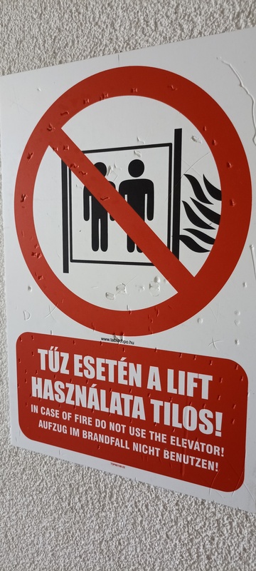 | 30. | 8. emeleten a „Tűz esetén a lift használata tilos” táblát megrongálták, cseréje szükséges. BK Pótoljuk BK Elkészült: 2025 07 22 KK A tábla cseréje megtörtént. Specifikus | |