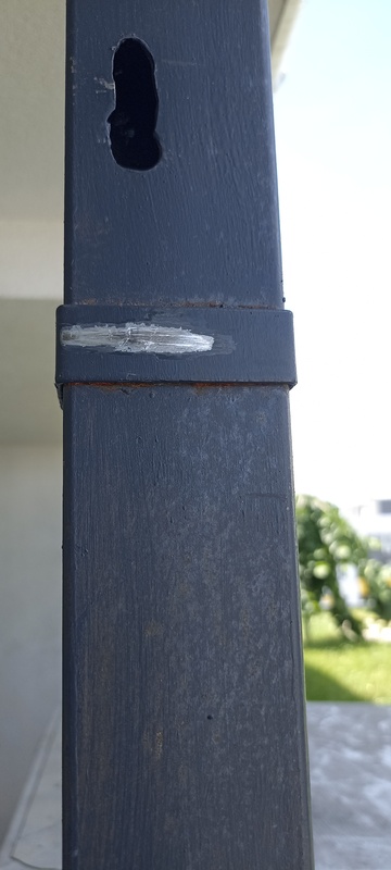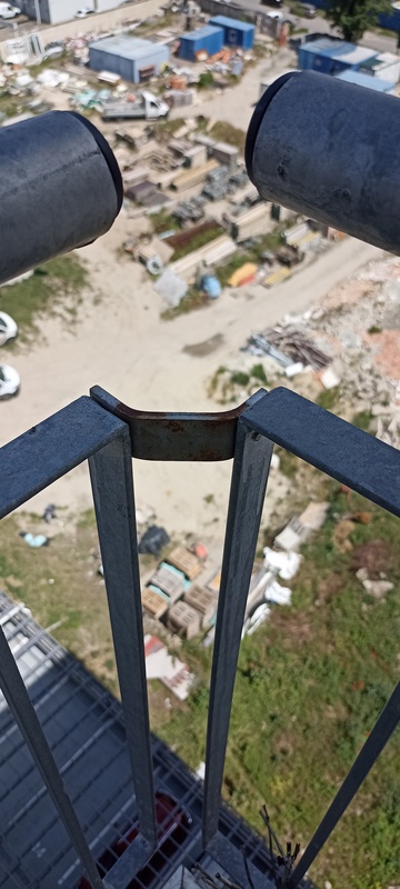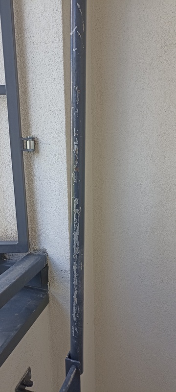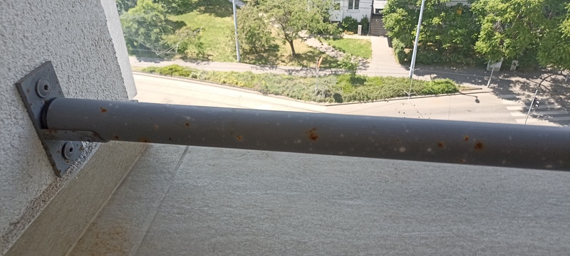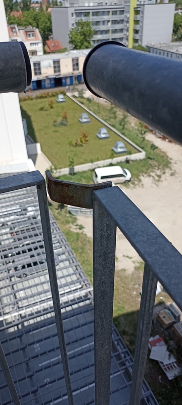 | 34. | Korlát összefogató vasak több helyen korrodálódtak, csak festett és nem horganyzott anyagból készültek. BK A 806-os lakás előtti korlát sarok javítjuk BK Elkészült: 2026 07 21 KK A jelölt helyen a javítás megtörtént, azonban ez egy általános, technológia hiba, mely az épület egészében megfigyelhető. Az anyagválasztás nem megfelelő és időtálló, anyagában ellenálló szerelvénnyel kell megvalósítani a kiegészítő és rögzítő elemeket is. Általános | |