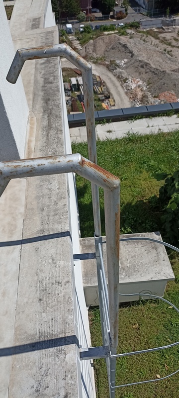 | 35. | „A” lépcsőház tetőlétra korlát csak vékony rétegben festett, korróziónak indult. BK Javítjuk BK Elkészült: 2025 07 21 KK A felületkezelés megtörtént, a korrózió megszűnt. Specifikus | |