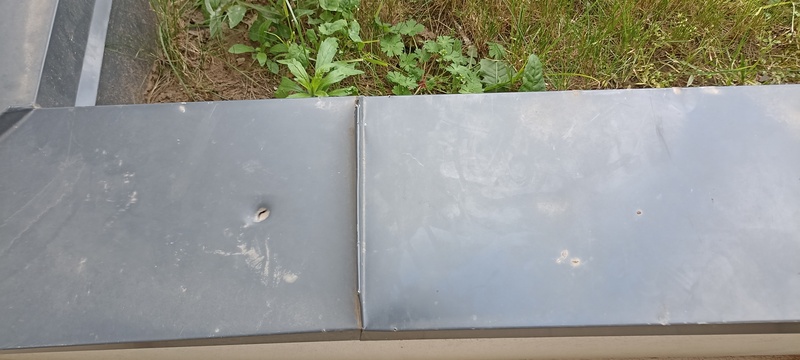 | 54. | PVC lemezszigetelés a terelő bádogozásnál át lett lyukasztva. BK Javítjuk BK Elkészült: 2025 08 19 KK A homlokzati terelőlemezek mindegyike kapott egy réteg PVC borítást, szemrevételezés alapján a vízzárás megfelelő. Általános | |