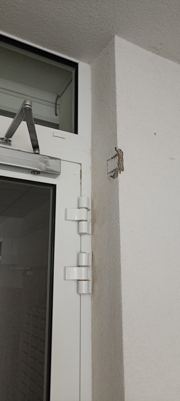| 115. | „A” lépcsőház bejárati ajtó behúzója sérült, nyitás határoló nincs, így a falazatba beleér, ami szintén sérült. BK Javítjuk BK Elkészült: 2025 07 18 KK Nyitás határoló felszerelése megtörtént, a bejáráskor törött volt, funkcióját nem látta el.